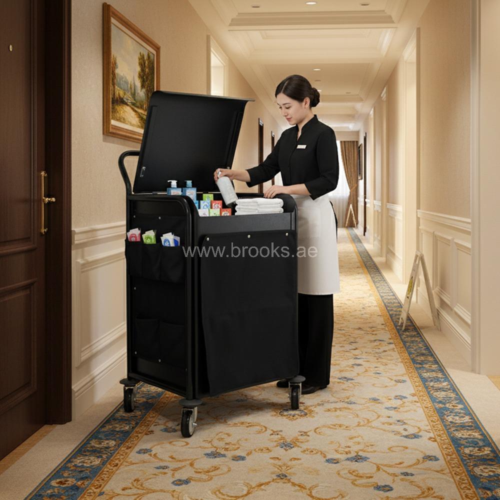 The Brooks Housekeeping Cart is designed to support the operational needs of housekeeping teams in hospitality, healthcare, and institutional environments. It’s a specialized service trolley whose principal function is to transport linens, amenities, cleaning supplies, and waste bags efficiently from storage or preparation areas to guest rooms or patient rooms. By centralizing all required supplies into one mobile unit, the housekeeping cart reduces the number of trips, improves workflow, helps maintain standards of cleanliness and presentation, and contributes to guest satisfaction. In essence, it becomes the mobile “home base” for a room-service attendant or housekeeper for a shift. In a hotel setting, the housekeeping cart becomes indispensable: as a housekeeper services multiple rooms, the cart carries clean linens, replacement towels, guest amenities (soap, shampoo, etc.), trash liners, and maybe even a small vacuum or dustpan. With the cart positioned in the hallway, the housekeeper reduces the back-and-forth to the supply room.