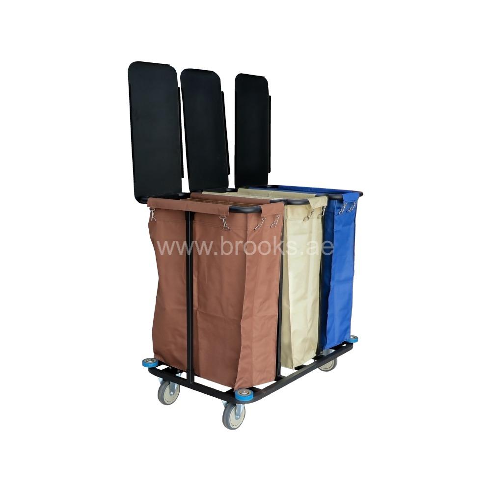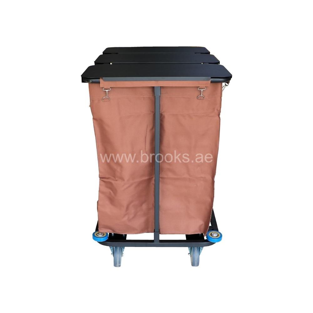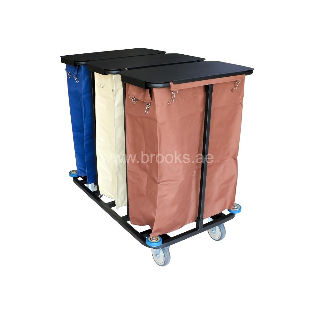 Stainless steel or other metal frame to provide rigidity and durability. The frame likely supports the fabric basket/body and the lid. The metal frame helps the cart stay upright, resist deformation, and handle loads. loth or fabric panels (could be canvas, Oxford cloth, or similar durable fabric) for the basket body. Fabric side panels, possibly with reinforcement in the base. A cover or flap lid to conceal laundry, possibly zip‑on or hinged, or removable. Lid helps with hygiene, odor control, and keeps laundry from spilling out. Given the listed dimensions for a comparable Brooks model (65 × 63 × 90 cm), the capacity is likely to be large enough to hold multiple loads of laundry. Very likely able to handle bedding, towels, etc. (i.e., substantial volume).