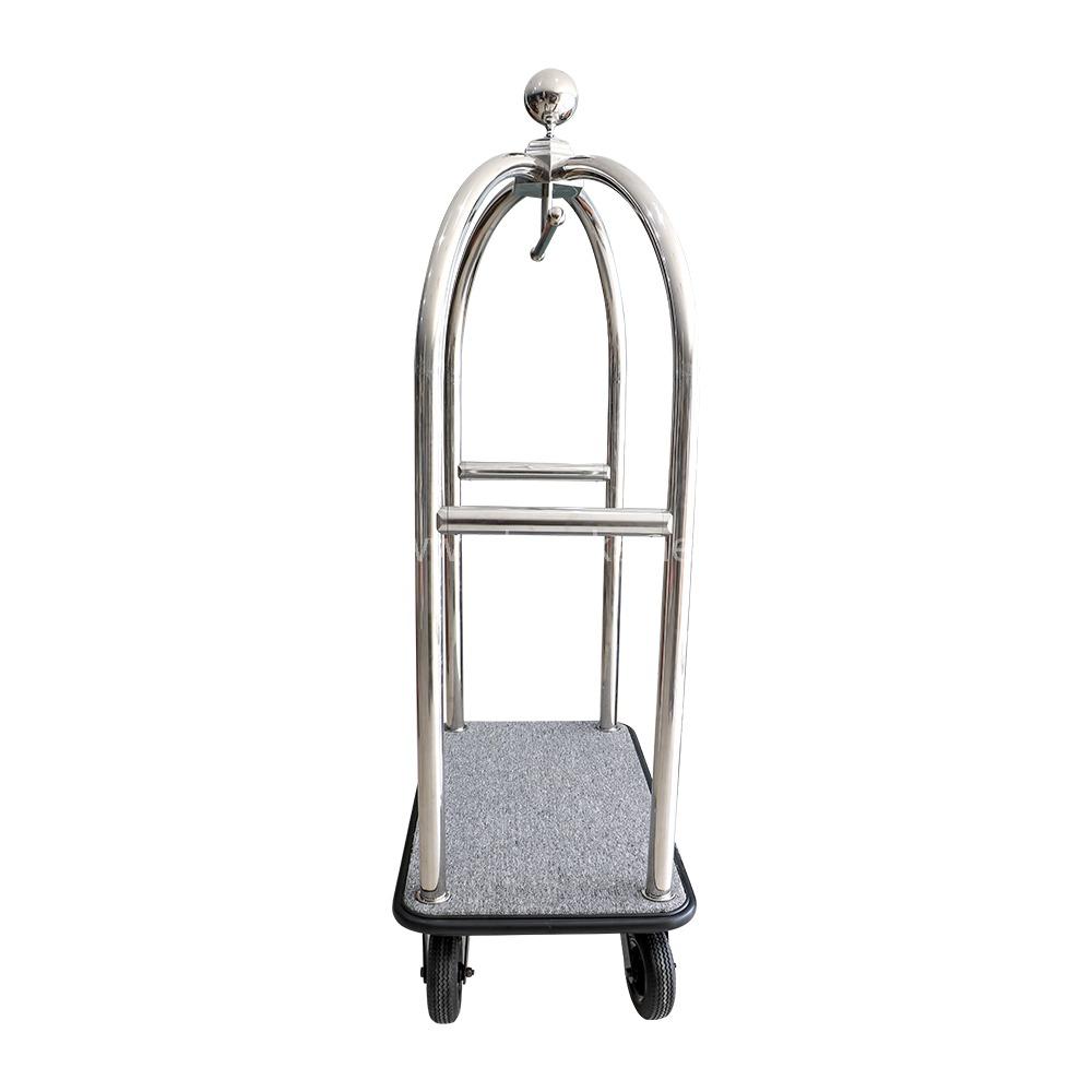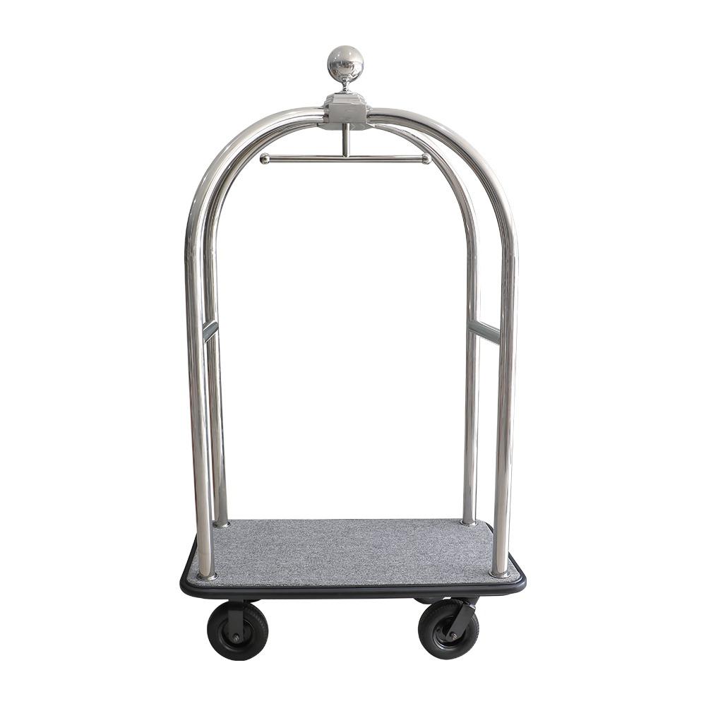 The Brooks Luggage Trolley in Silver + Grey Carpet finish is designed to combine functionality with refined style, making it a perfect choice for hotels, resorts, and high-end service environments. Its polished silver frame, paired with the soft grey carpeted platform, creates a sophisticated look that complements any setting while ensuring guests’ belongings are handled with care. Built with a strong metal frame, this trolley offers excellent stability and strength to handle heavy luggage loads with ease. The premium carpeted base not only adds a luxurious touch but also prevents scratches and damage to luggage, ensuring a safe and smooth transport experience. Designed for efficiency in busy hospitality environments, this trolley offers ample space for multiple pieces of luggage. Its sturdy construction and elegant design make it both a practical work tool and a stylish addition to guest service operations.