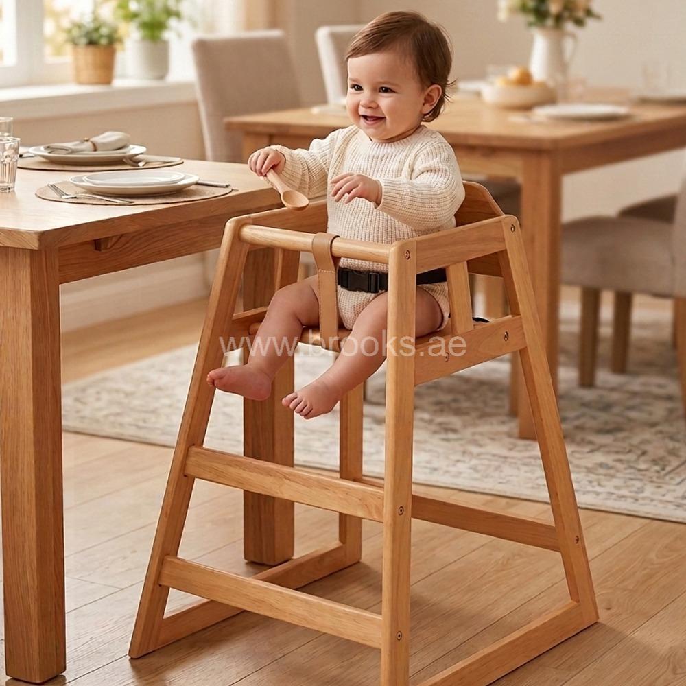 The Brooks Olna Wooden Dining Baby High Chair Natural Wooden is a beautifully crafted baby feeding chair designed to bring both functionality and elegance to family mealtimes. Made from solid natural wood, this high chair provides a safe and stable seating option for babies and toddlers while they eat or participate in family activities at the dining table. The natural wooden finish highlights the grain and texture of the wood, giving the chair a warm and timeless appearance that blends easily with most home interiors. Unlike plastic high chairs, wooden designs are often preferred for their durability, aesthetic appeal, and long-lasting performance.