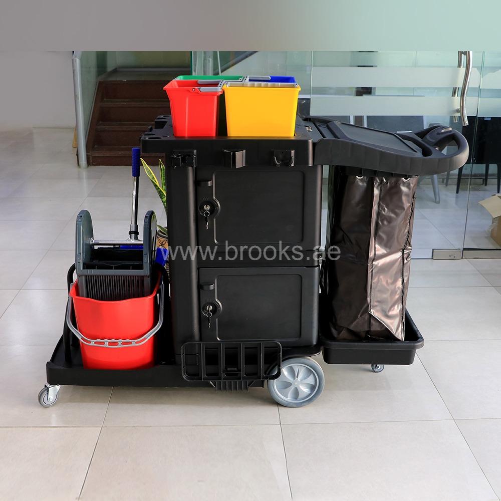The Brooks Valxio Janitor Cart Mop Wringer 20Ltr+Door+Cart Bag+4Buckets 6Ltr is a comprehensive mobile cleaning solution that combines high-capacity waste transport, mop wringing efficiency, and organized tool storage in a single professional-grade trolley system. Designed for custodial staff, housekeeping teams, and facility maintenance crews, this janitor cart integrates a 20-liter mop bucket with an effective wringer mechanism that lets users remove excess water from mop heads without bending or using their hands directly, improving ergonomic comfort and reducing fatigue during extended cleaning sessions.