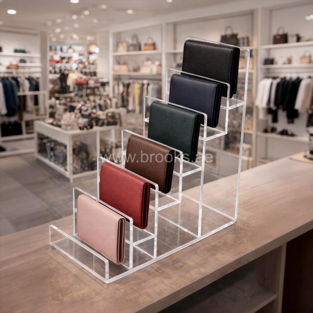 The Veelex Clear Acrylic Wallet Display Stand (6 Layers) is a stylish and highly functional organizer designed to showcase wallets, small handbags, sunglasses, or accessories in a clean and professional way. Featuring a multi-tier (six-layer) structure, this display stand allows multiple items to be arranged in a cascading format, ensuring each piece remains visible and easy to access. Made from high-quality transparent acrylic, it creates a sleek “floating” visual effect that enhances the appearance of the displayed products while keeping the focus entirely on them. This type of stand is commonly used in retail stores, boutiques, and exhibitions, as well as for personal organization at home.